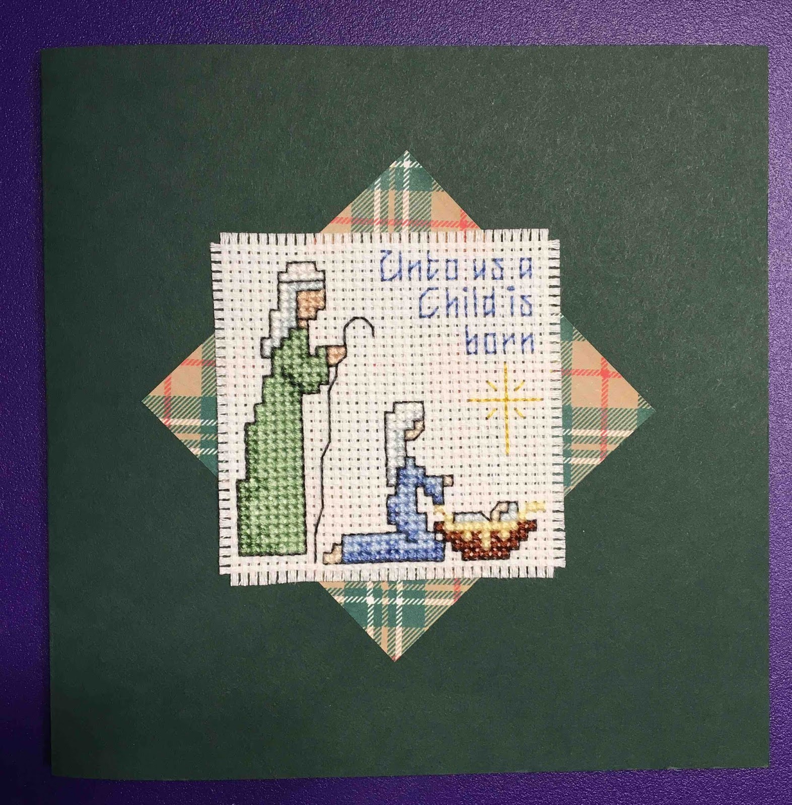 This design was stitched in 2016 and finally turned into a card. It may not be obvious from the picture, but the blue ornament can be removed and hung on a tree.